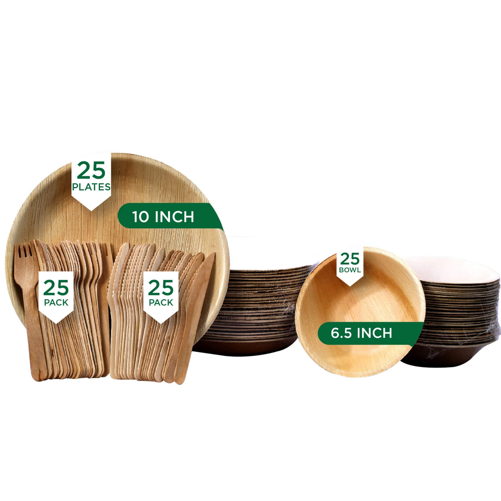 Raj Palm Leaf Plates [100-Pack] 25 x 10" Plates, 25 x 6.5" Bowls, 25 Forks, 25 Spoons like Bamboo plates Disposable, Compostable Tableware for wedding, Dinner, Birthday, Camping, Outdoor BBQ, Picnic