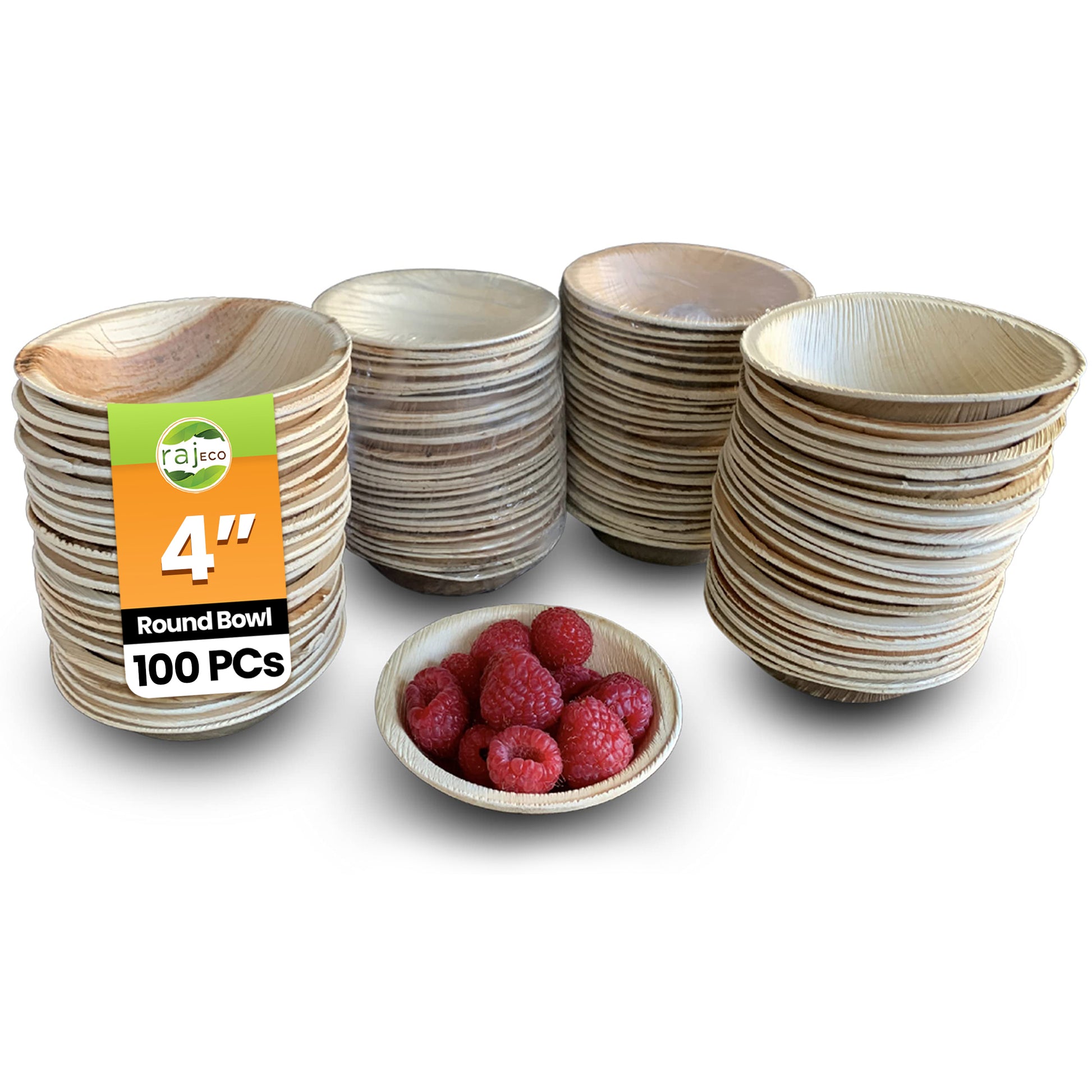 Raj Disposable Palm Leaf Bowls (100 Count, 4" Bowls) Strong Bowls Like Bamboo Party Bowls - Decorative Compostable Tableware for Lunch, Dinner, Birthday, Outdoor, BBQ, Picnic, Parties